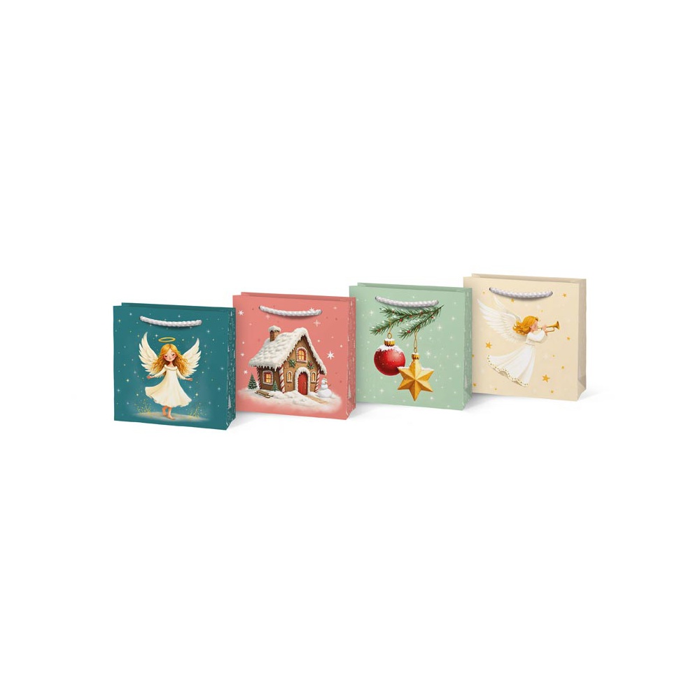 Díky malému formátu působí taška mile a osobně – jako drobná pozornost, která potěší ještě před rozbalením. Taška je doplněna bílými šňůrkovými uchy, které jsou praktické a ladí s celkovým vzhledem. Skvělá volba pro sváteční balení drobných dárků s vánoční atmosférou.