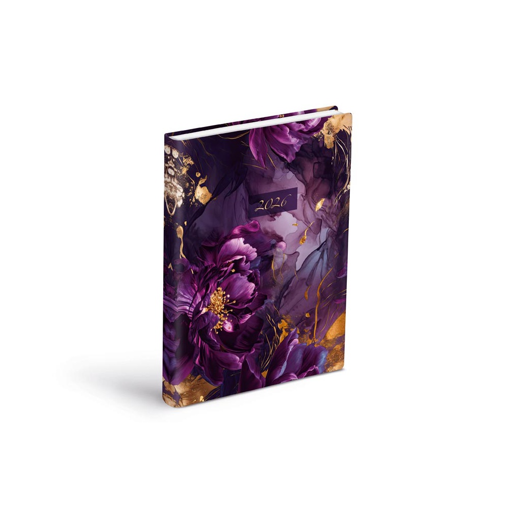 Denní diář 2026 ve formátu A5 spojuje praktičnost s uměleckým dojmem. Výrazný květinový motiv v odstínech fialové a zlaté dodává celému provedení luxusní, téměř mystický nádech.