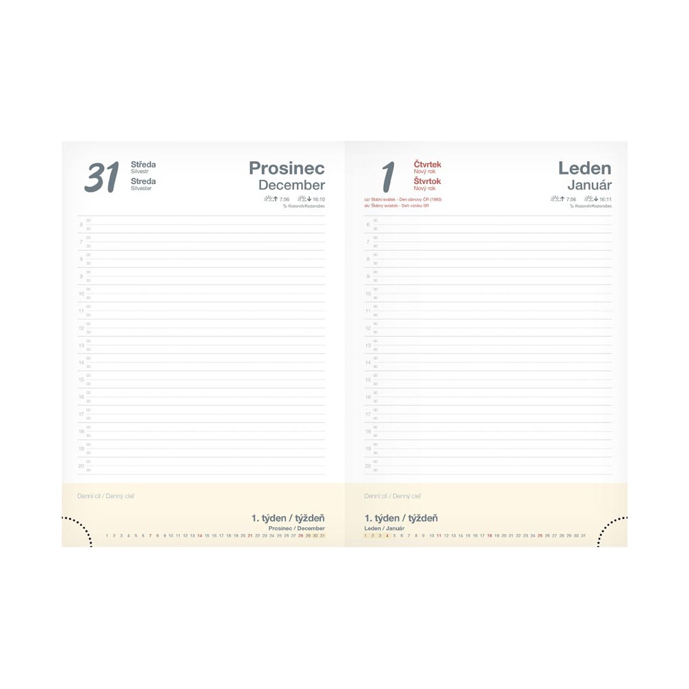 Povrch diáře je z měkkého, na dotek sametově hebkého materiálu (PU), který je odolný a příjemný při každodenním používání. Odtrhávací rožky zpříjemňují orientaci v diáři a umožňují rychlé nalistování aktuálního dne. Uvnitř najdete denní rozvržení s dostatkem prostoru na vše, co si potřebujete zapsat – od úkolů po myšlenky.