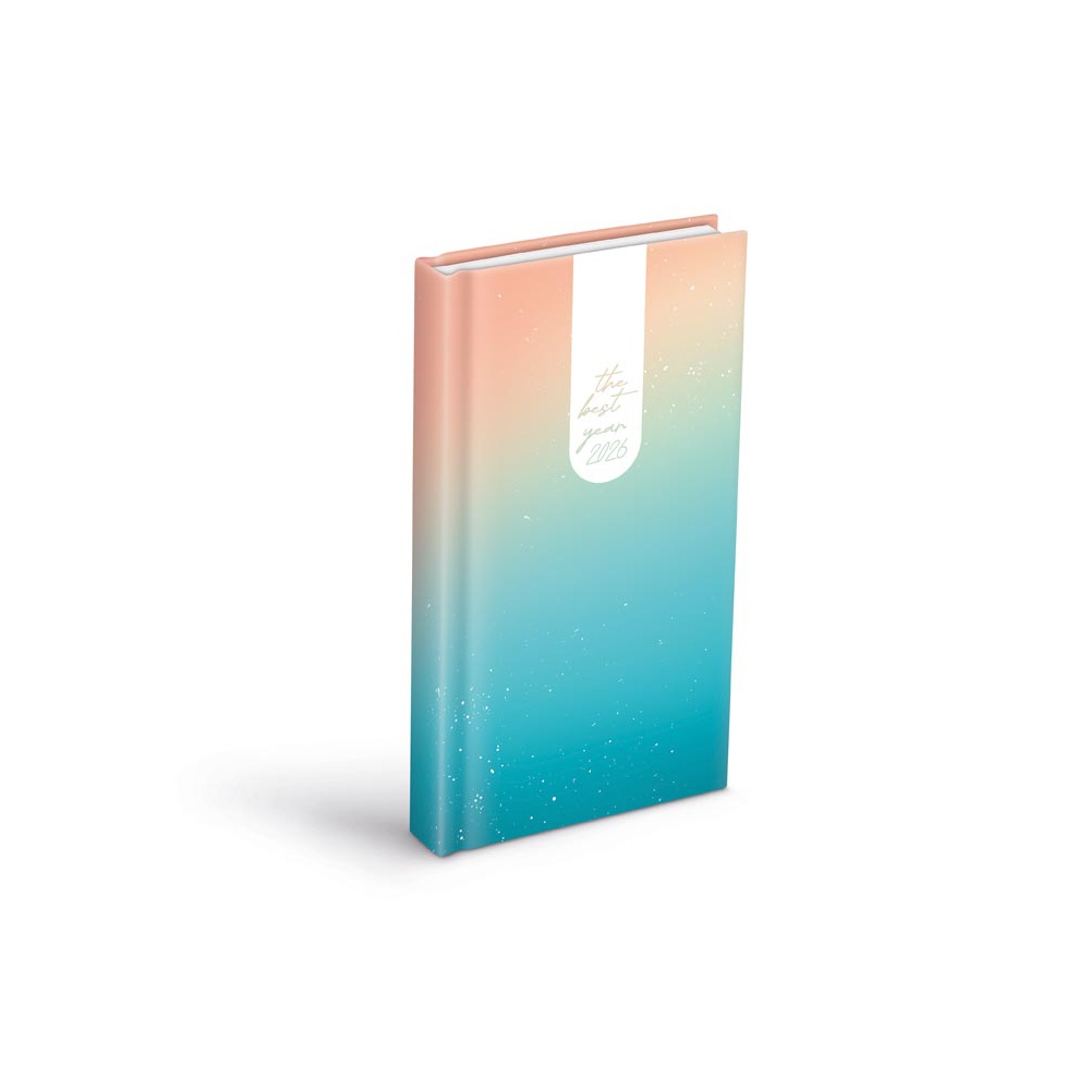 Denní diář pro rok 2026 vyniká svým jemným, ale výrazným designem – pastelový přechod z broskvové do tyrkysové působí jako klidný západ slunce na pobřeží.