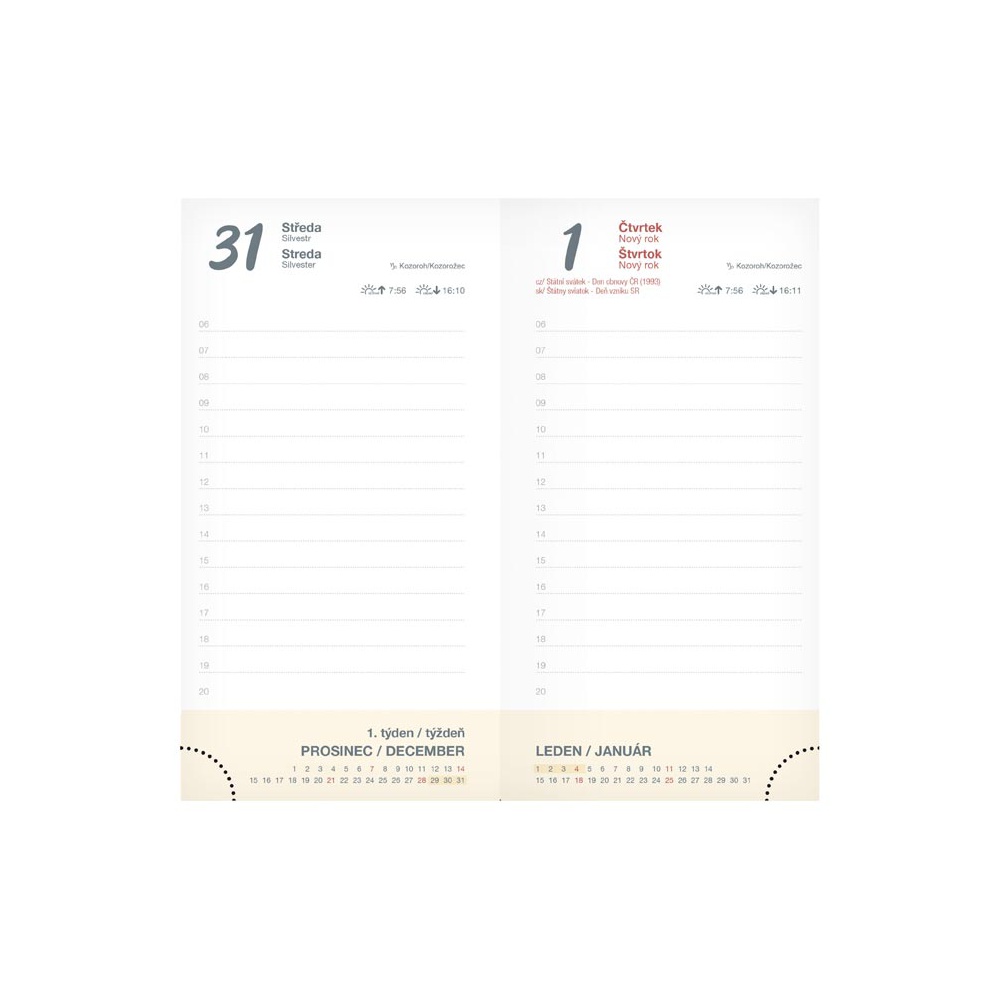 Matné lamino s parciálním lakem chrání obálku diáře před opotřebením a zároveň vytváří zajímavý kontrast matného povrchu a lesklých detailů. Díky praktickému formátu se vejde do kabelky, batohu i kapsy kabátu, takže ho můžete mít vždy po ruce, kdykoli Vás napadne něco důležitého. Odtrhávací rožky pomáhají udržet přehled a okamžitě Vás navedou na správnou stránku.