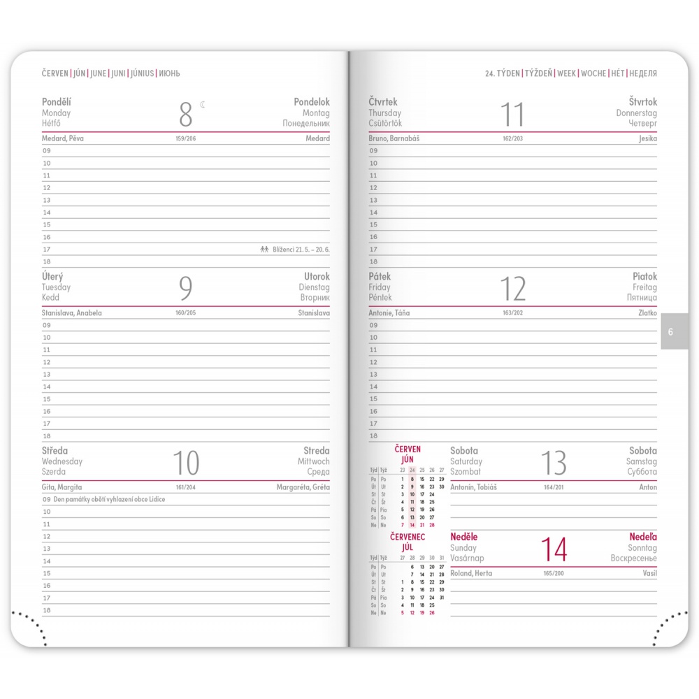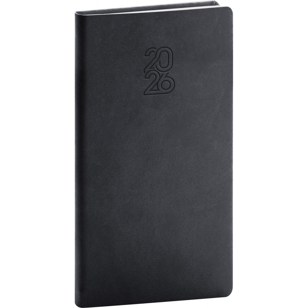 Kapesní diář Aprint 2026 v černé barvě. Kolekce vsadila na osvědčené barvy, které doplňuje nová ražba letopočtu. Týdenní rozvrh s česko-slovenským kalendáriem a doplňkovou angličtinou, němčinou, maďarštinou a ruštinou.
