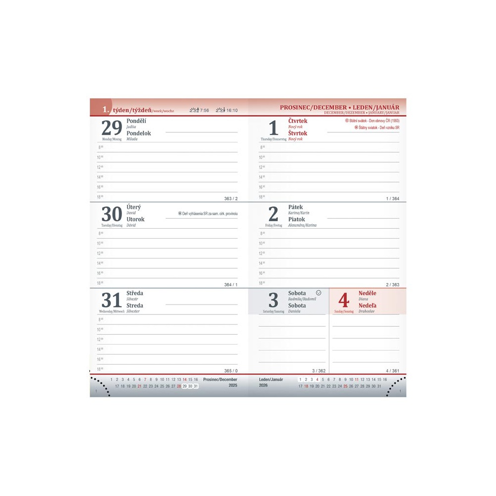 Povrch diáře je příjemný na dotek a odolný proti opotřebení. Díky kompaktní velikosti je snadno přenosný a nezabírá zbytečně místo. Uvnitř najdete přehledné týdenní uspořádání, které vám umožní snadno organizovat každý týden. S odtrhávacími rožky je orientace v diáři rychlá a jednoduchá.