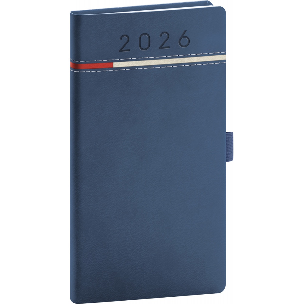 Kapesní diář Tomy 2026 v modro-červené barvě. Klasický povrch imitující kůži, který doplňuje jemné prošití. Na materiál lze tisknout a je vhodný pro všechny typy ražeb. Týdenní rozvrh s česko-slovenským kalendáriem a doplňkovou angličtinou, němčinou, maďarštinou a ruštinou.