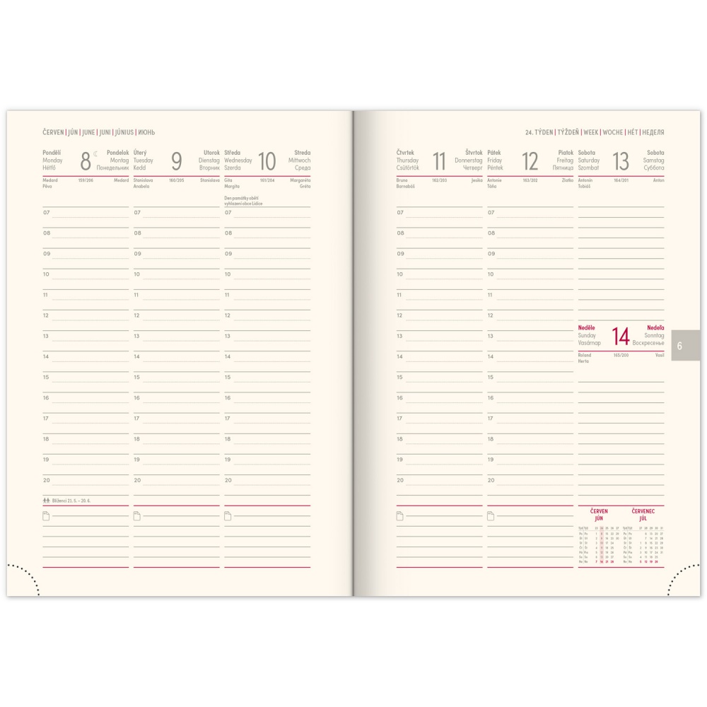 Nová, cenově dostupná řada diářů s obálkou z ekologického papíru spojuje styl a udržitelnost. Týdenní rozložení s česko-slovenským kalendáriem a doplňkovou angličtinou, němčinou, maďarštinou a ruštinou.