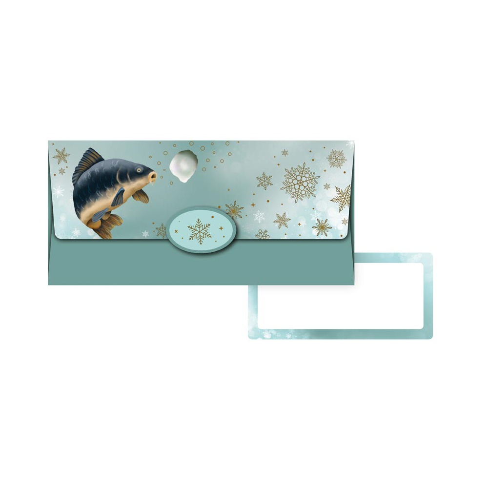 Tato elegantní obálka na peníze s motivem kapra přináší tradiční atmosféru Vánoc v moderním a svěžím provedení. Kapr jako typický symbol českých svátků je zde doplněn jemnými sněhovými vločkami a decentními zlatými detaily na ledově modrém pozadí. Obálka je ideální pro předání finančního daru nebo dárkového poukazu.