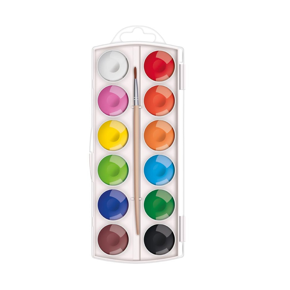 Sada vodových barev, 11 klasických a 5 metalických barev, velikost puku 23 mm. Barvy jsou vhodné zejména na malbu na papír či karton. Namalujte si s dětmi obrázek pomocí vodových barev, které vynikají jasnou barevností. Děti se zabaví a navíc rozvinou motoriku ruky a svou fantazii.